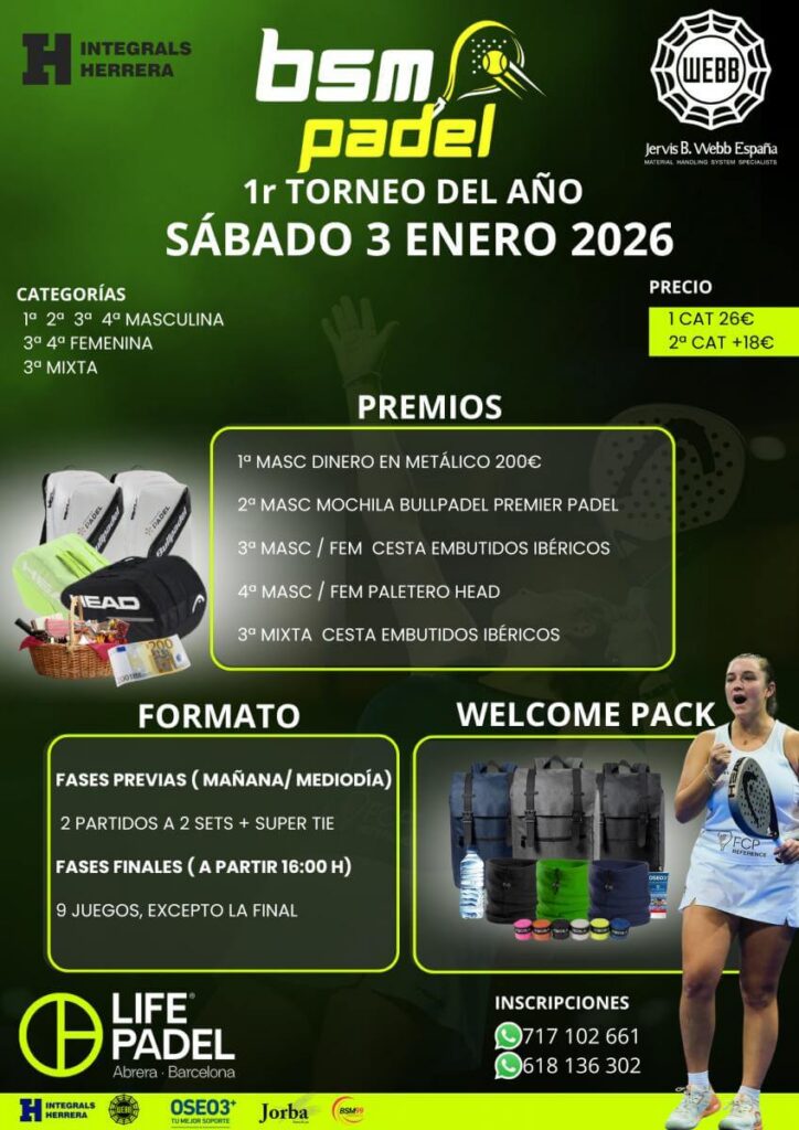 El Torneo BSM Pádel del 3 de enero de 2026 en Life Padel Abrera (Barcelona) es el primer gran evento de pádel del año para jugadores aficionados que quieren competir, mejorar su nivel y optar a premios en un ambiente social y dinámico.